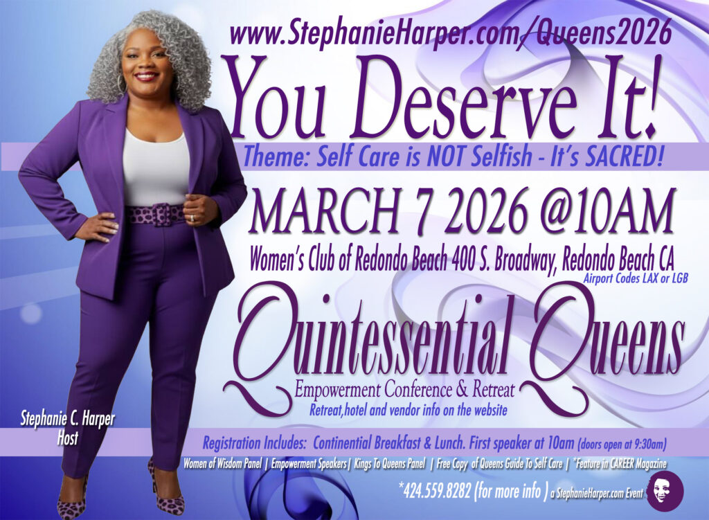 To kick off Women’s International Month, YOU ARE INVITED to join us for the annual Queens conference on Saturday, March 7, 2026! Yes, “You” Deserve It! You have a choice to register for “just” the conference on Saturday or spend the full weekend with the Team of Queens and enjoy the pre-conference retreat on Friday (see the weekend -at-a glance http://www.stephanieharper.com/weekend)