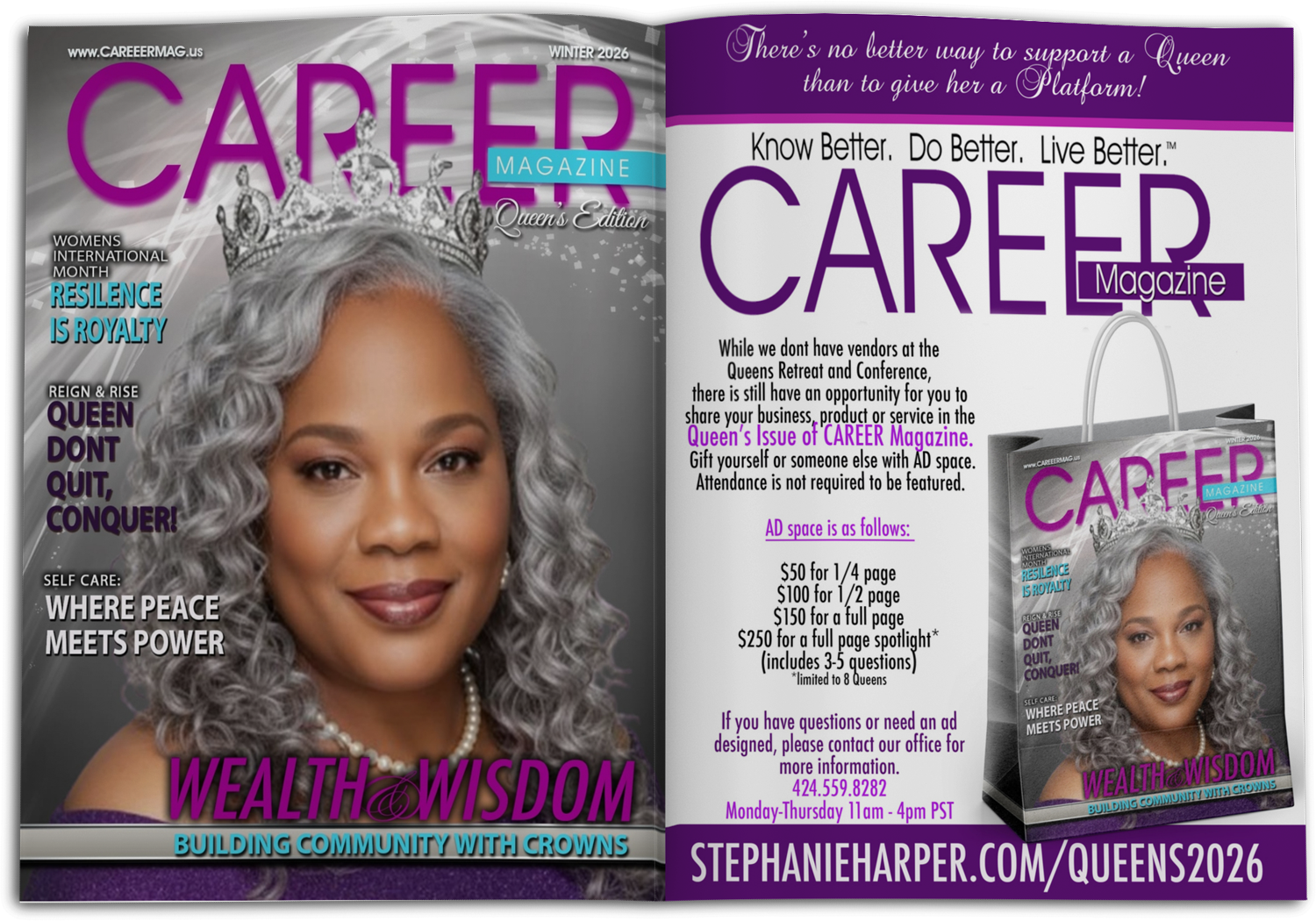 By design, we don’t offer vendor opportunities for the Queens Conference and Retreat. The goal for event is to give you an experience that focuses 100% on you, the Queen within. But we are keenly aware, that our event kicks of Women’s International Month and we want to share your shine and uplift your crown! With that being said, you still have an opportunity to showcase your platform (book, business or brand), in the Queen’s Edition of CAREER Magazine. You do not have to attend the conference/retreat to be featured. This issue will be mailed out the week of Queens, so that you and our event participants have an opportunity to share collectively. Images must be at 300dpi and submitted no later than January 31, 2026. This requires more than a registration link, so to move forward in this process, give us a call at 424.559.8282. The best time to reach us is Monday – Thursday, 11am to 3pm PST. If we miss your call, just leave a message or send a text and we will respond accordingly.